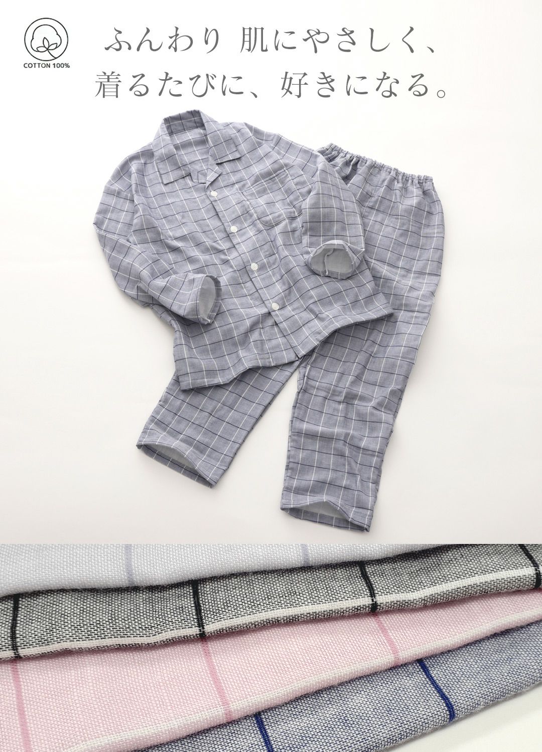 他の画像を見る ふんわりやわらか、着る度に好きになる、贅沢3重ガーゼパジャマ ユニセックス / 3重ガーゼ チェック柄 雲ごこちパジャマ 販売価格 ¥ 9,889 税込 カートに入れる お気に入りに登録する