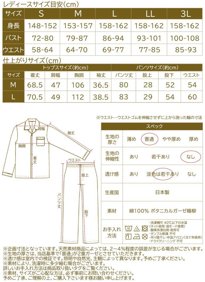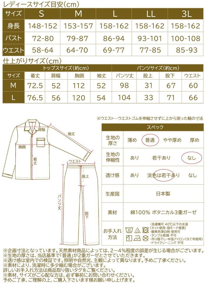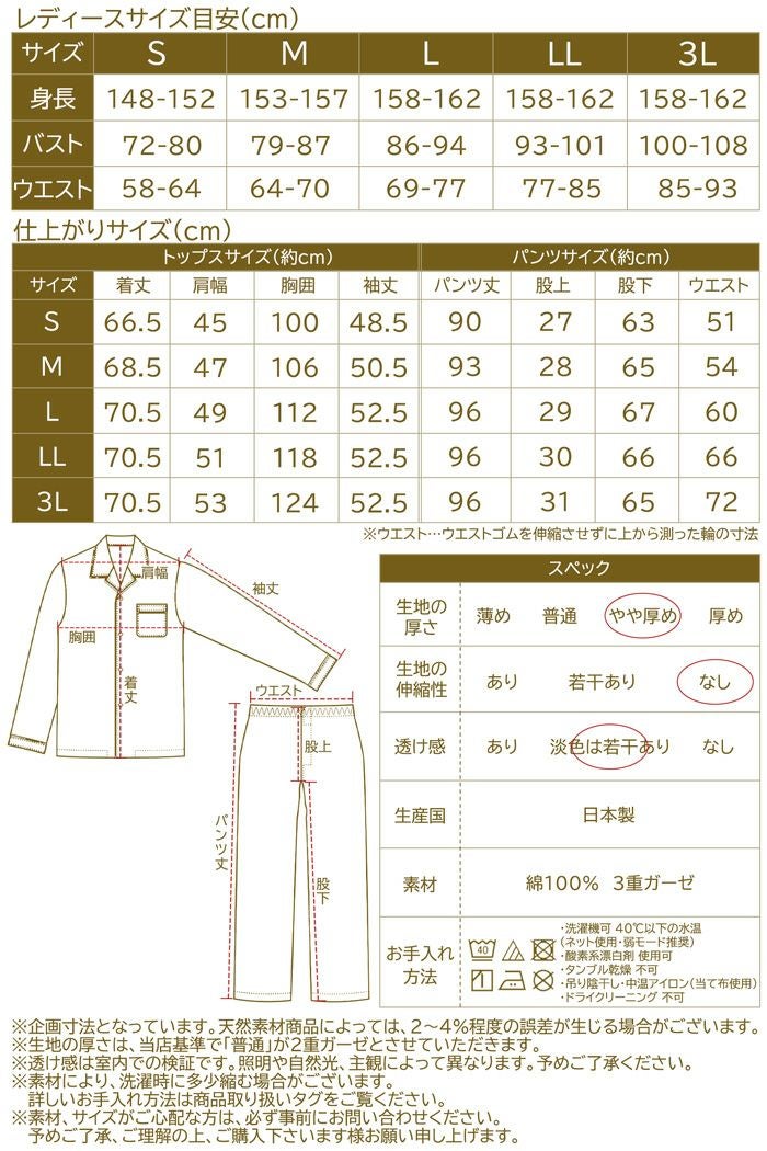 他の画像を見る 日本製 レディース 3重ガーゼ 綿100% S M L LL 3L レディース / 3重ガーゼ 無地 コットンパジャマ 販売価格 ¥ 9,889 税込 カートに入れる お気に入りに登録する